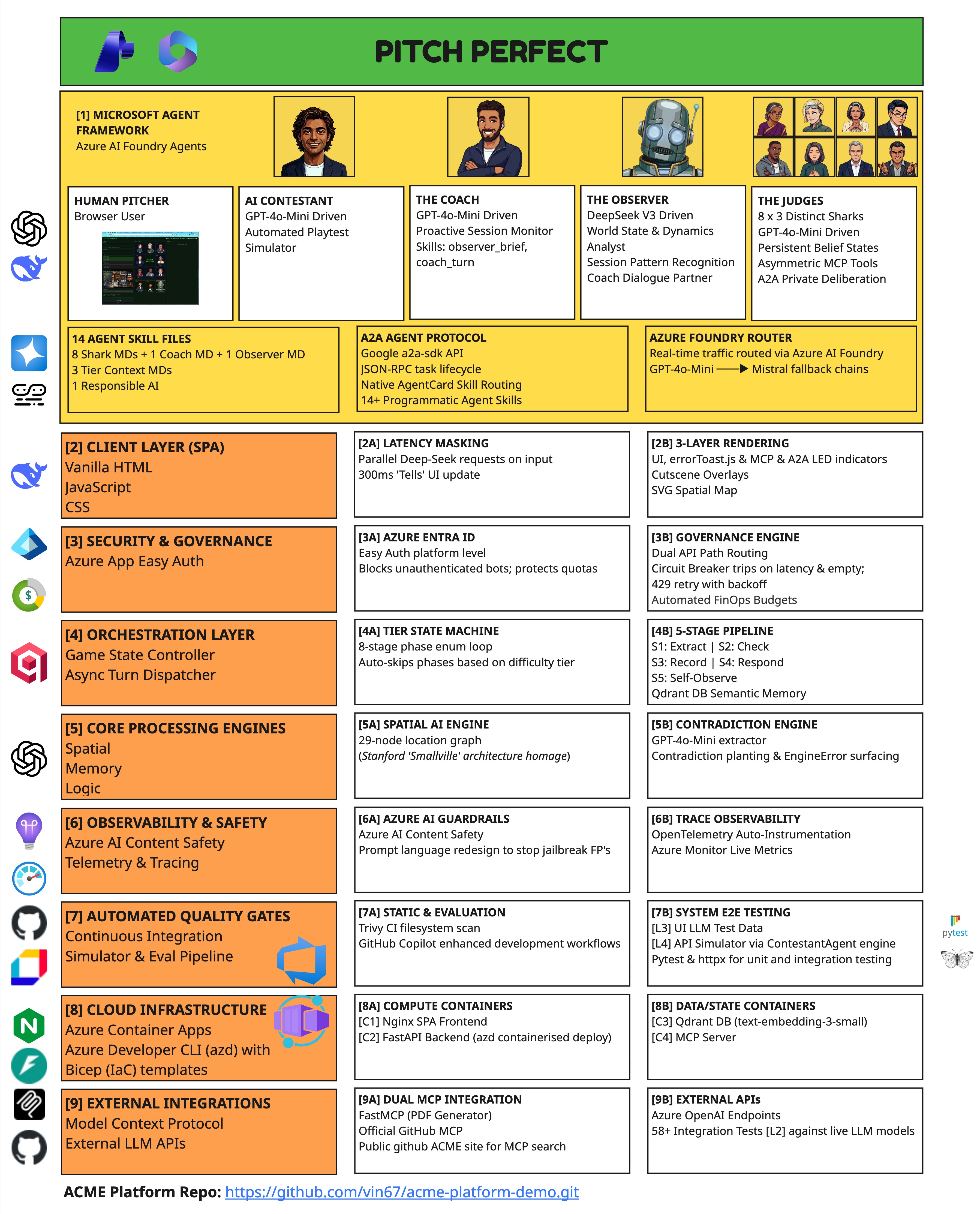 “Pitch Perfect started as a hackathon idea and became a production-grade multi-agent platform — 8 sharks, 11 model deployments, 940 tests, and a single-command Azure deployment. The sharks remember everything.”