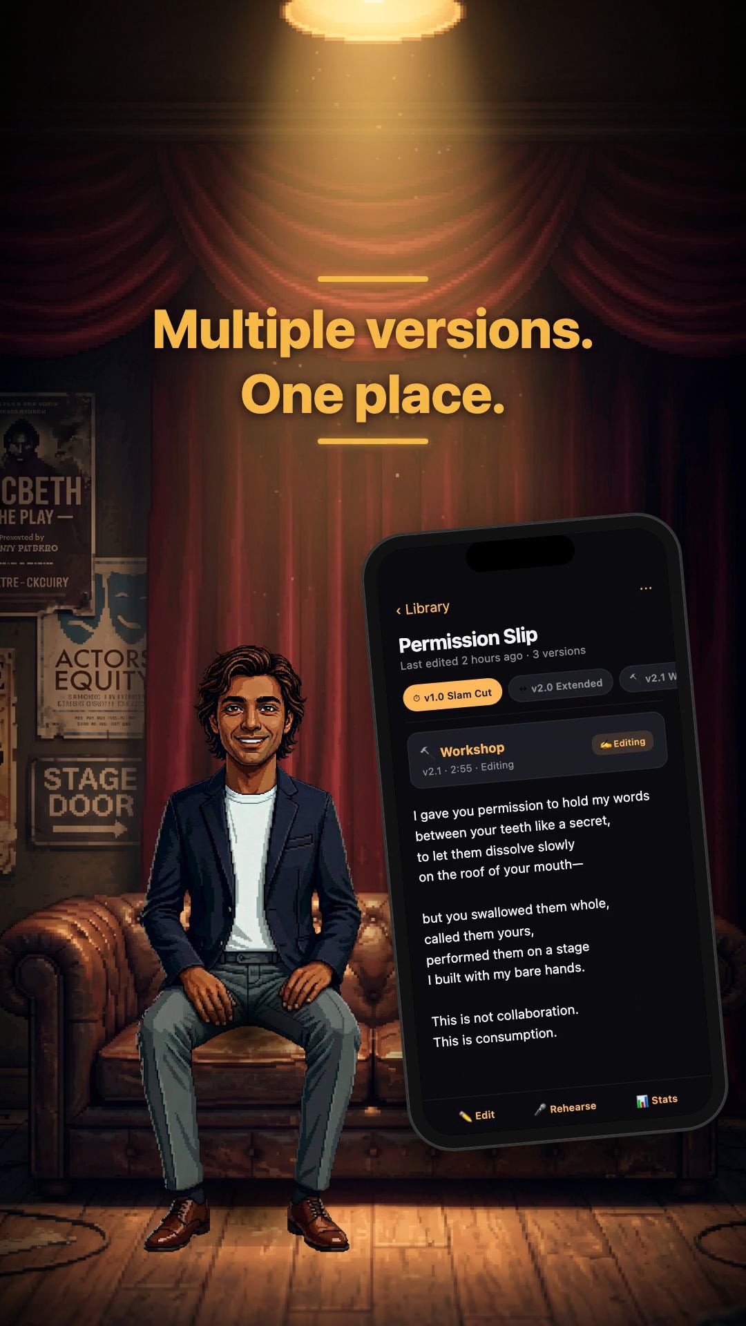 Three minutes for a slam, two minutes for rapid-fire, five for a feature set. Each version carries its own rehearsal history, annotations, and target duration. Compare any two versions side by side with inline colour-coded diffs to see exactly what changed.